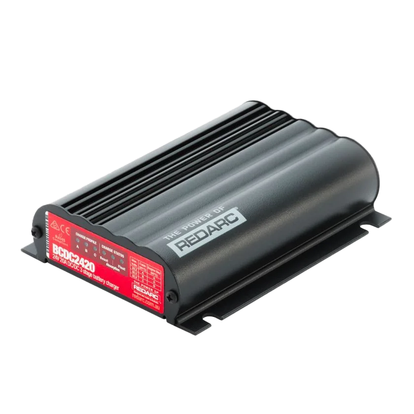 The REDARC BCDC2420 battery charger is a 24 Volt 20 Amp, three stage DC DC charger that operates from a vehicle input between 9 and 32 Volts DC. It is designed to charge any commonly used automotive 24V battery system to an optimal level with chemistry specific battery charging algorithms.